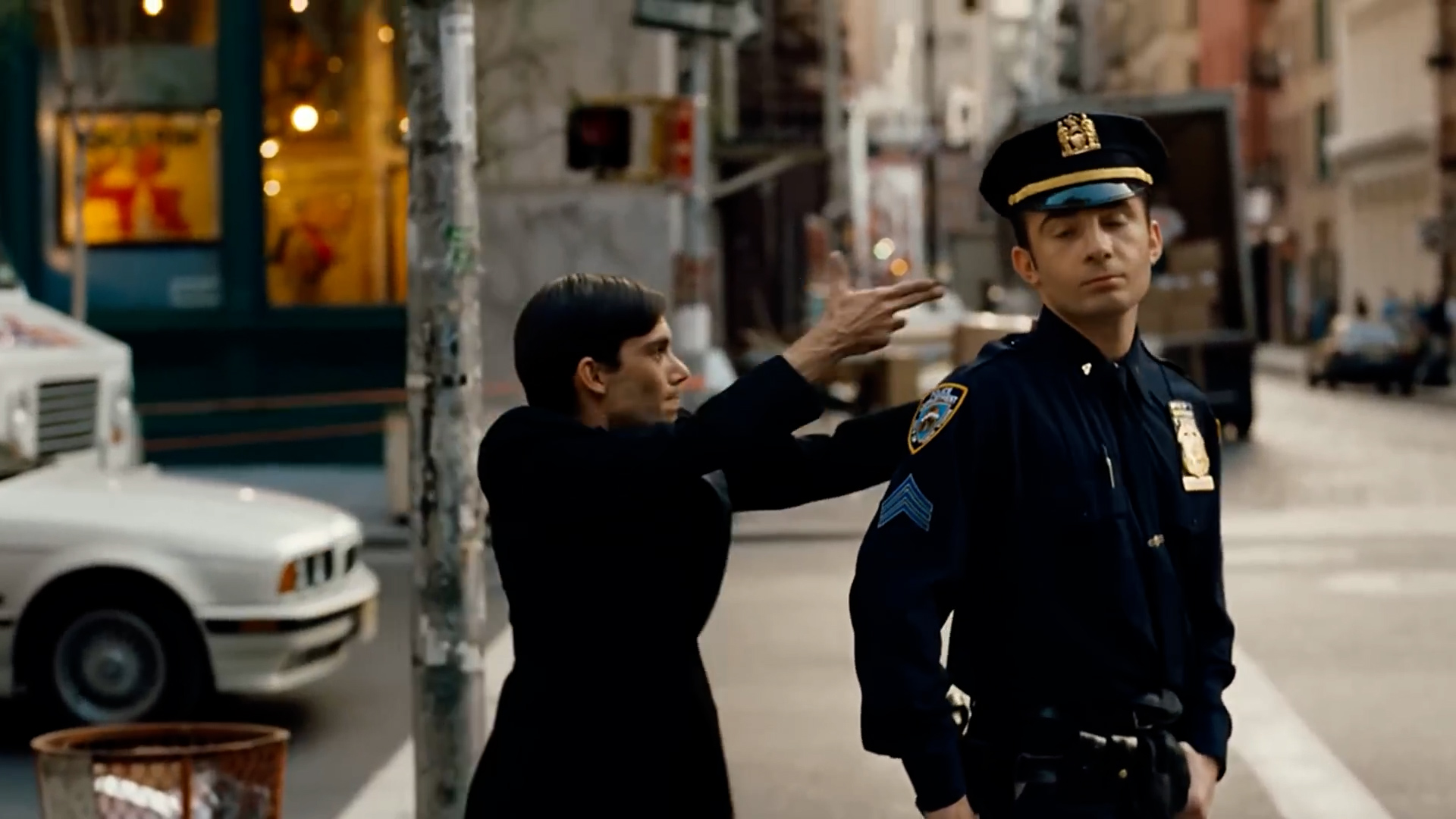 Finally able to outrun Reznor, he finds himself in a different part of town. As he tries to soothe his frazzled nerves, he begins to notice people staring at him. This culminates in a priest inexplicably shooting a police officer in the back of the head point-blank. With a finger gun.